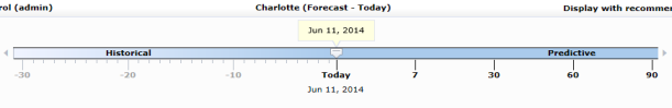 Historical dates on the slider are limited by the number of days the environment was refreshed since the historical timeframe is enabled to a maximum of 30 days. Data in future timeframes is controlled by the growth modeling features within the policy and the availability of historical workload data. Not all future timeframes may be enabled for the environment.