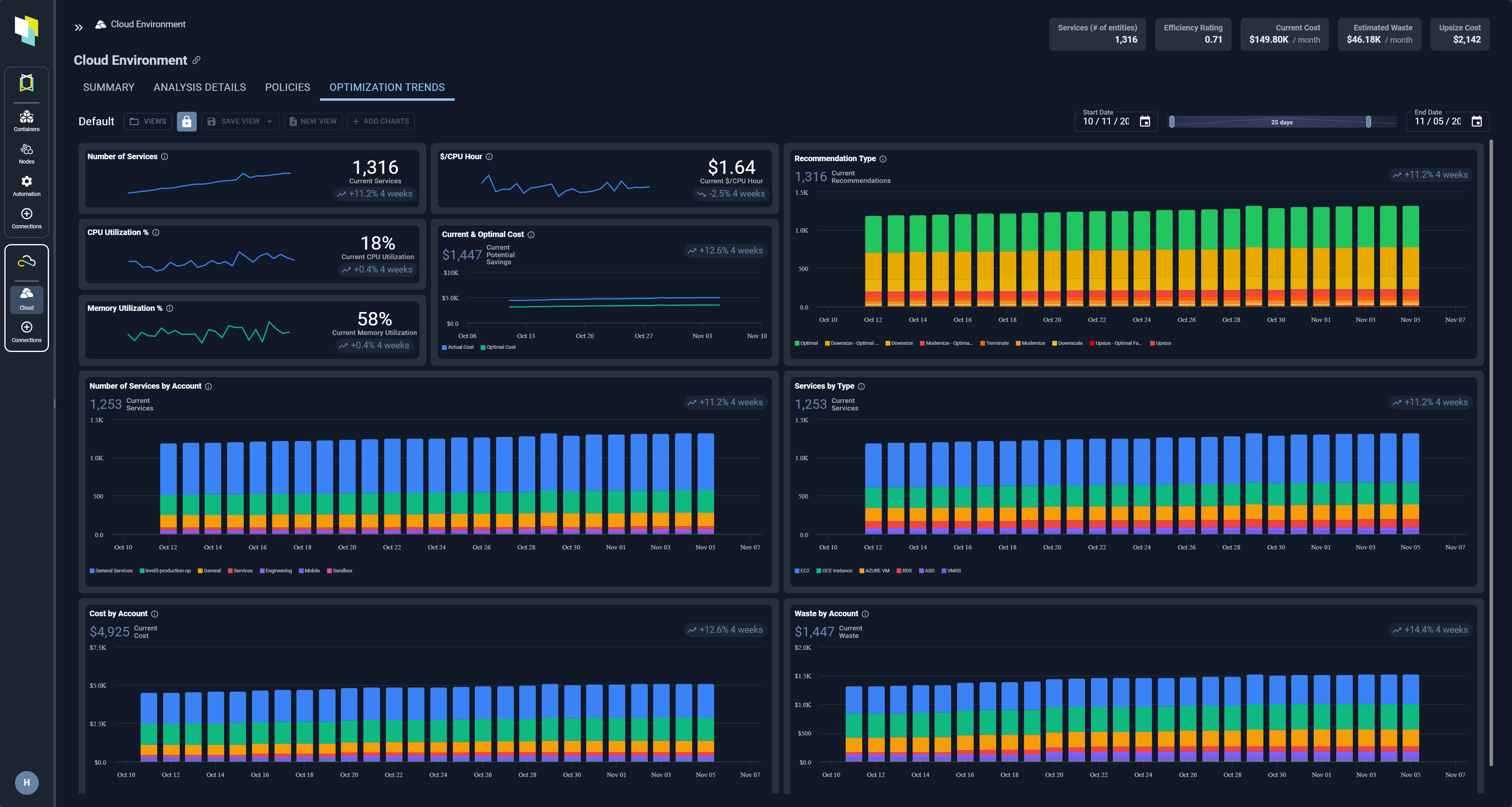 Track KPIs such as current vs optimal costs, $/CPU Hour, and CPU & Memory Utilization, along with other metrics that are key to determining progress. Focus through views that include only the charts and metrics of interest – arranged exactly the way you want.