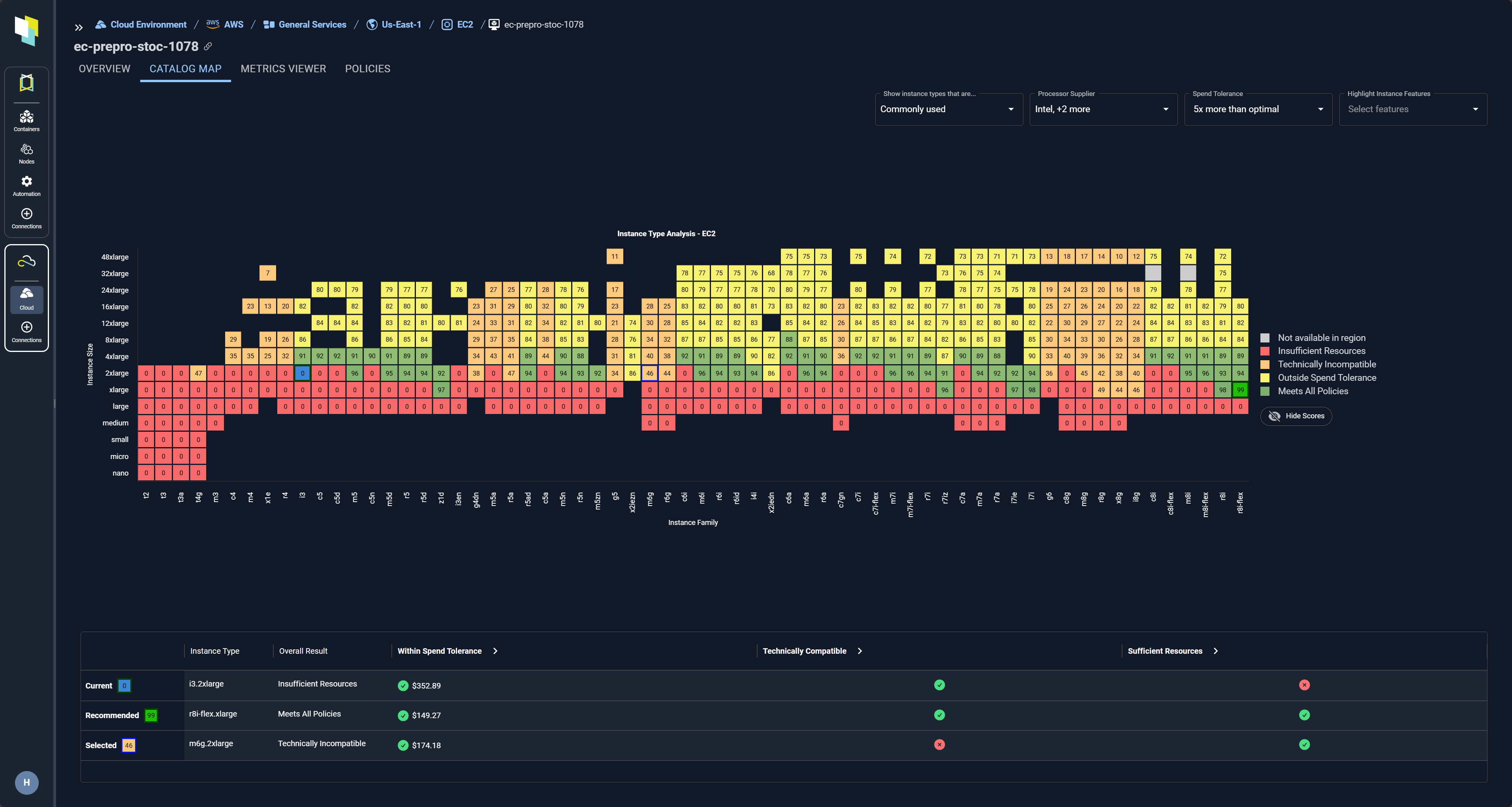Visualize how a workload fits with all available instance types in a CSP catalog. Kubex tells you which instances:
