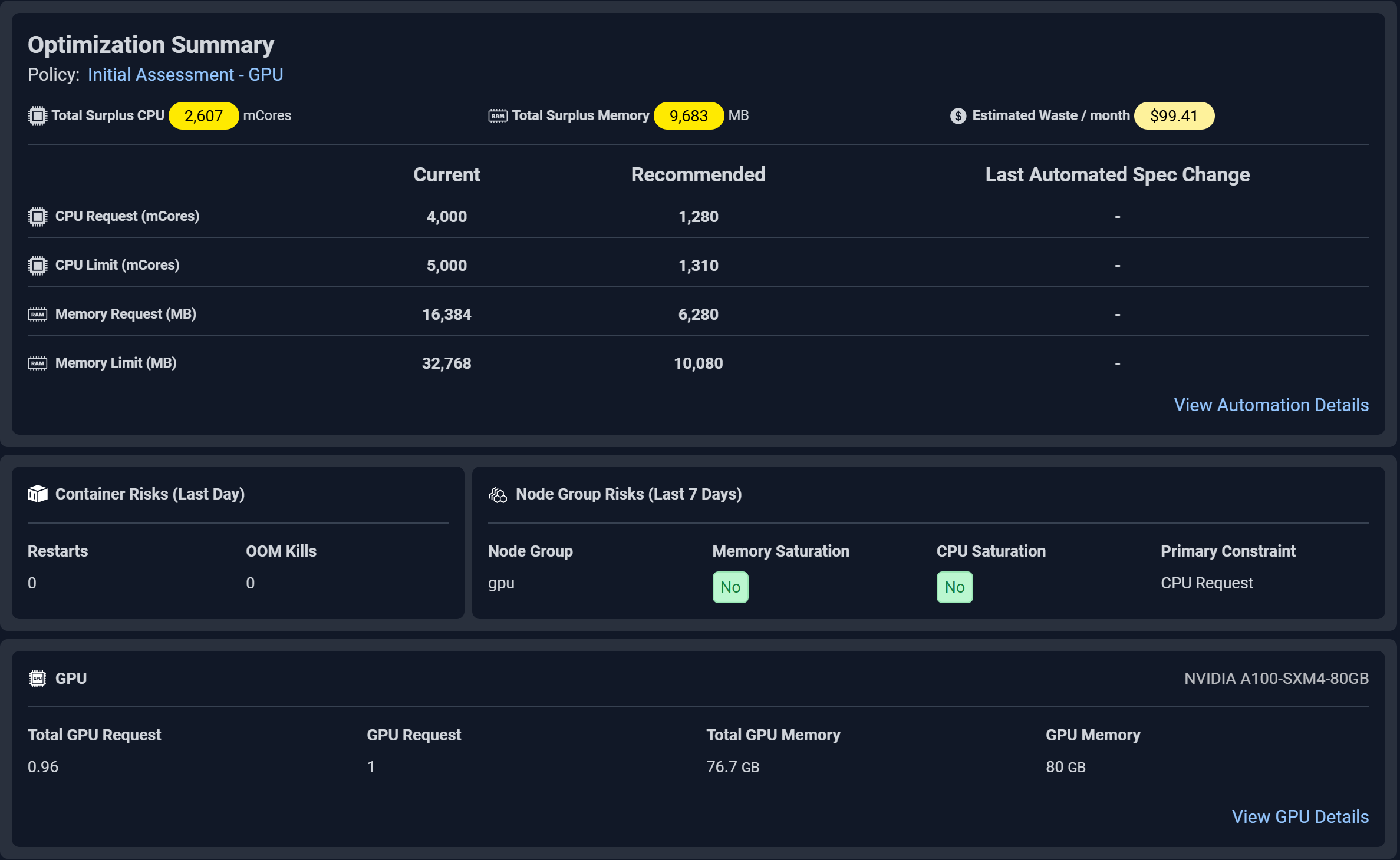 - Learns real workload behavior to recommend ideal CPU, memory, and GPU requests