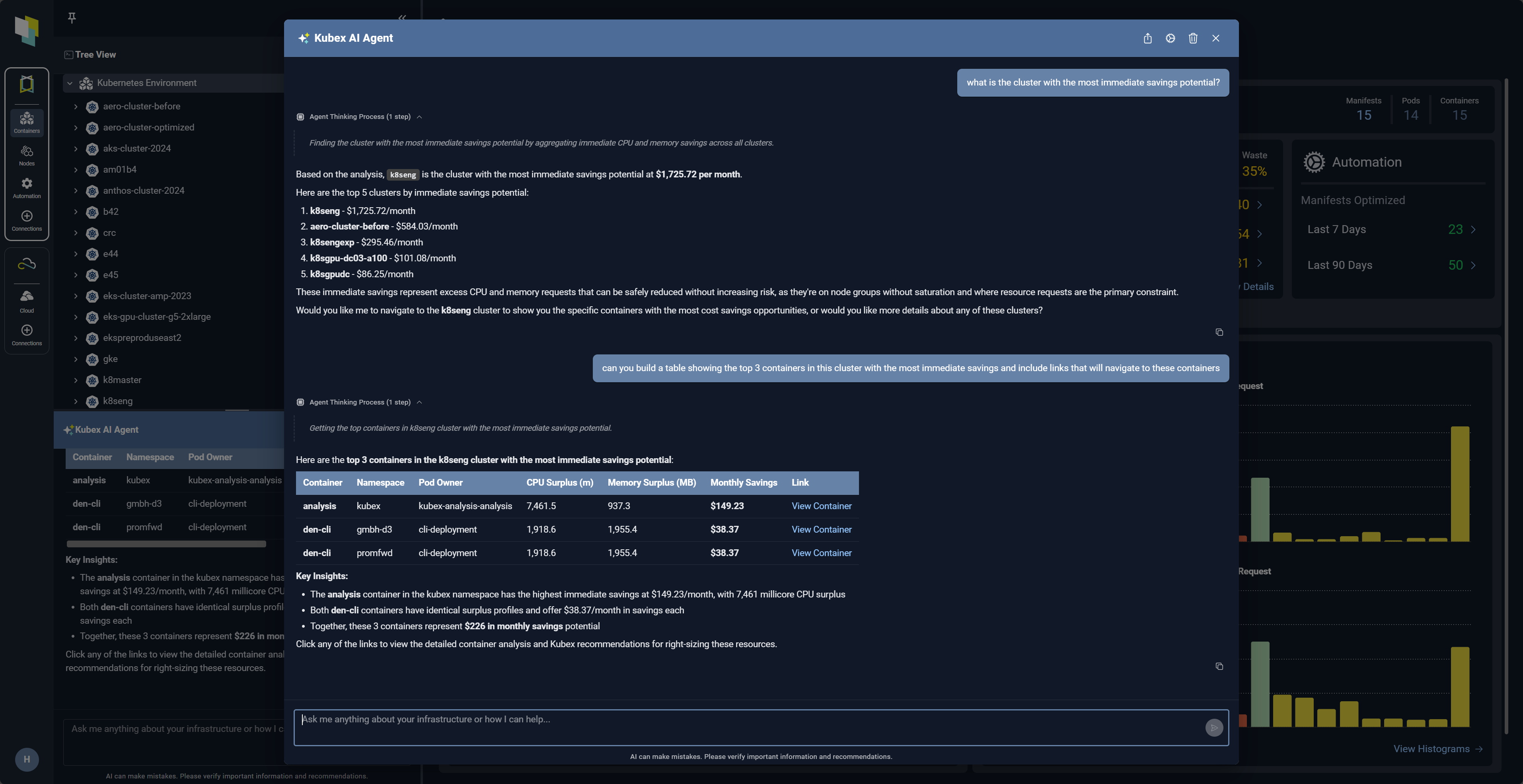 Agentic AI combines Kubex’s market leading optimization intelligence with a chat-based AI assistant that makes the power of Kubex available to everyone.